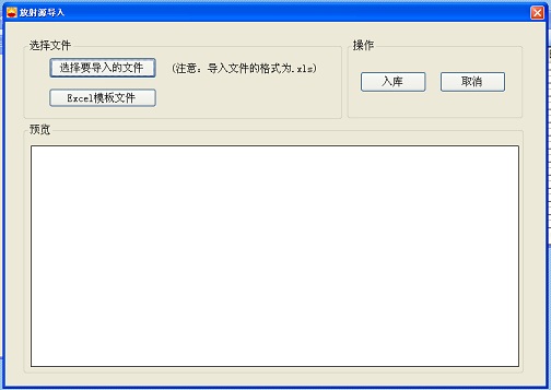 1、按钮“Excel模板文件”,点击该按钮可获取导入放射源信息的标准Excel模板;