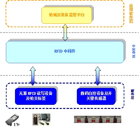系统利用RFID技术、指纹识别、数码自控技术贯穿枪支等轻武器使用的每个关键环节,实现枪械自动识别、枪械信息自动采集、枪位状态实时侦听,并通过中间件将采集与处理的数据提供给监管软件系统,形成一个有效、准确的对枪支等装备的出入库、库房监管、使用维护等智能管理的数字化平台。 系统可自动记录枪支编号和显示枪支的在位情况、自动记录枪支的出入库情况及持枪人情况、自动记录枪支和弹药的库存情况、自动打印枪支和弹药的出入库表、枪支档案、弹药收付台帐及持枪人档案等。与枪支、弹药有关的信息全部记录和存储在计算机中,可以随时查询、打印,完全取代了原来用笔进行记录和签字的方法;实时监控报警系统可对枪库库门、枪支锁、弹药柜柜门及入库的枪支进行监控,对非法的开门、枪支离位情况进行报警并记录。 根据用户需求、应用流程分析,本项目整个枪械及装备信息管理系统由三个层次构成,其结构如下图所示: 系统总体结构